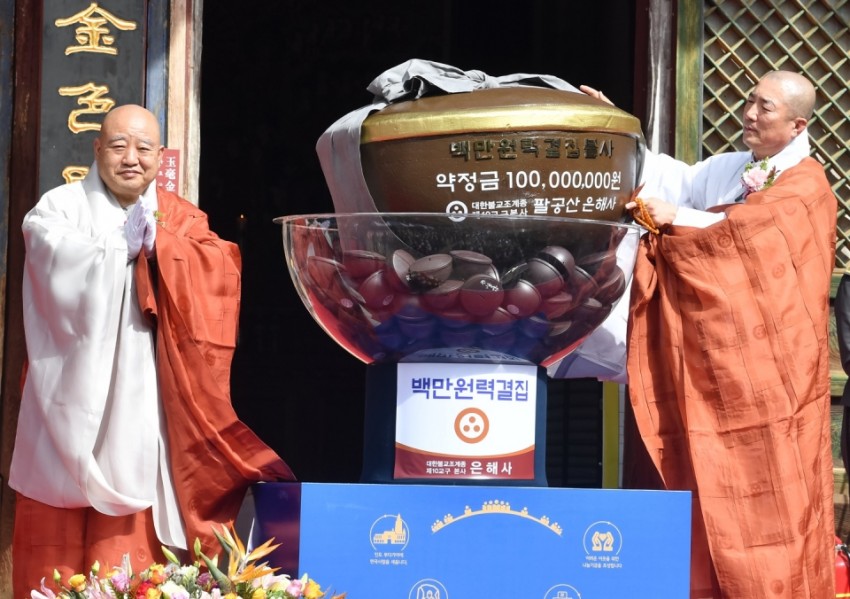 은해사 주지 돈관스님은 “어떤 종교와 사상도 발전하는 사회에 쫓아가지 못한다면 도태할 것”이라는 어느 학자의 말을 인용하며 한국불교 미래를 준비하는 백만원력 불사의 당위성을 짚었다. 특히 “하루 100원이라는 작은 정성을 꾸준히 모아 밝은 미래로 나아가는데 동참하자”고 역설한 돈관스님은 1억원의 백만원력 불사 기금 약정과 함께 지름 1m 발우 모양의 대형 저금통을 선보여 눈길을 끌었다.